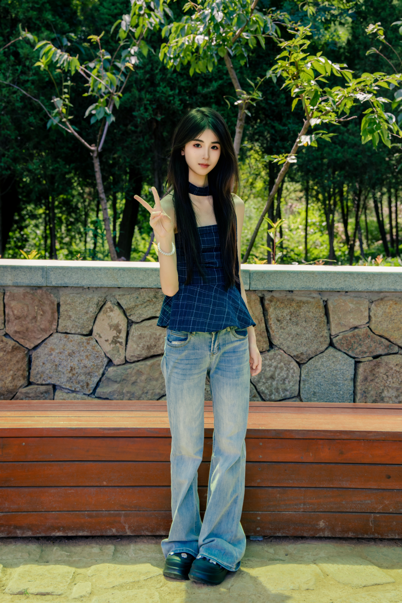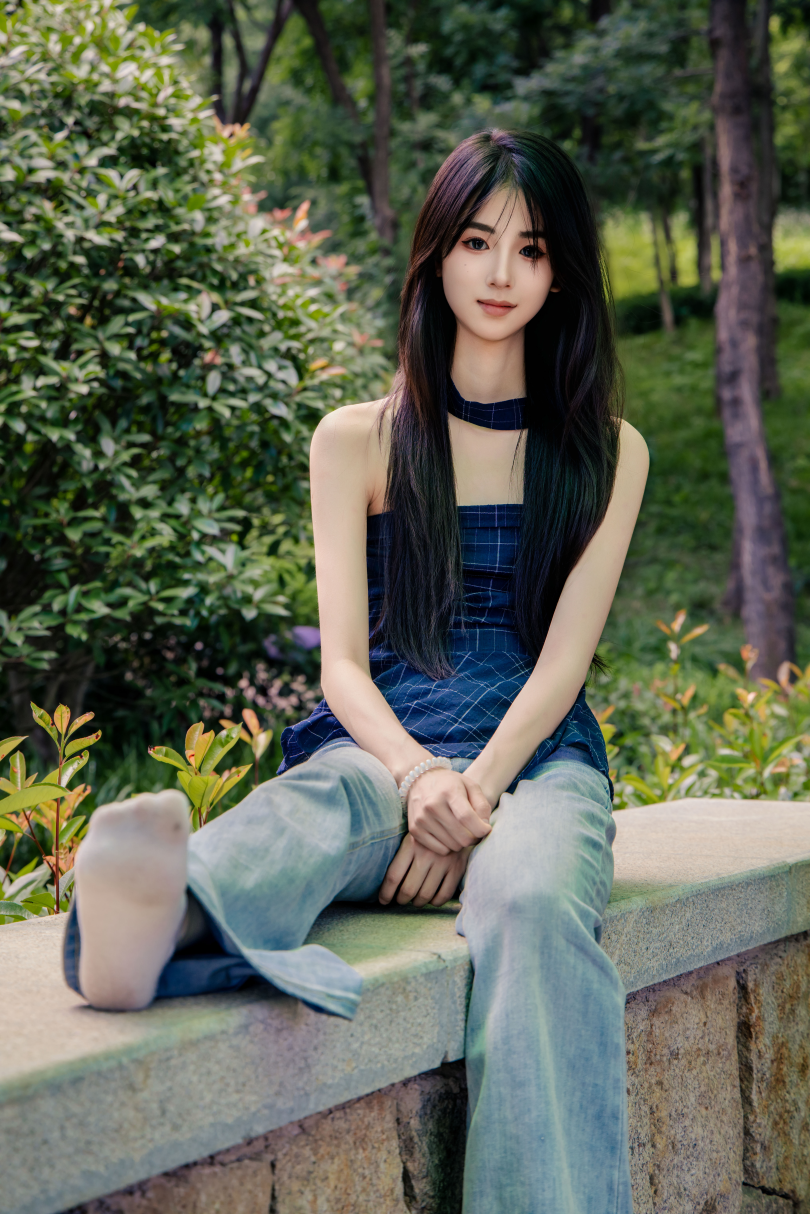 足愉心摄影第49期:模特小瑶(搭配:蓝色格子吊带、牛仔长裤、白棉袜、洞洞鞋、裸足)