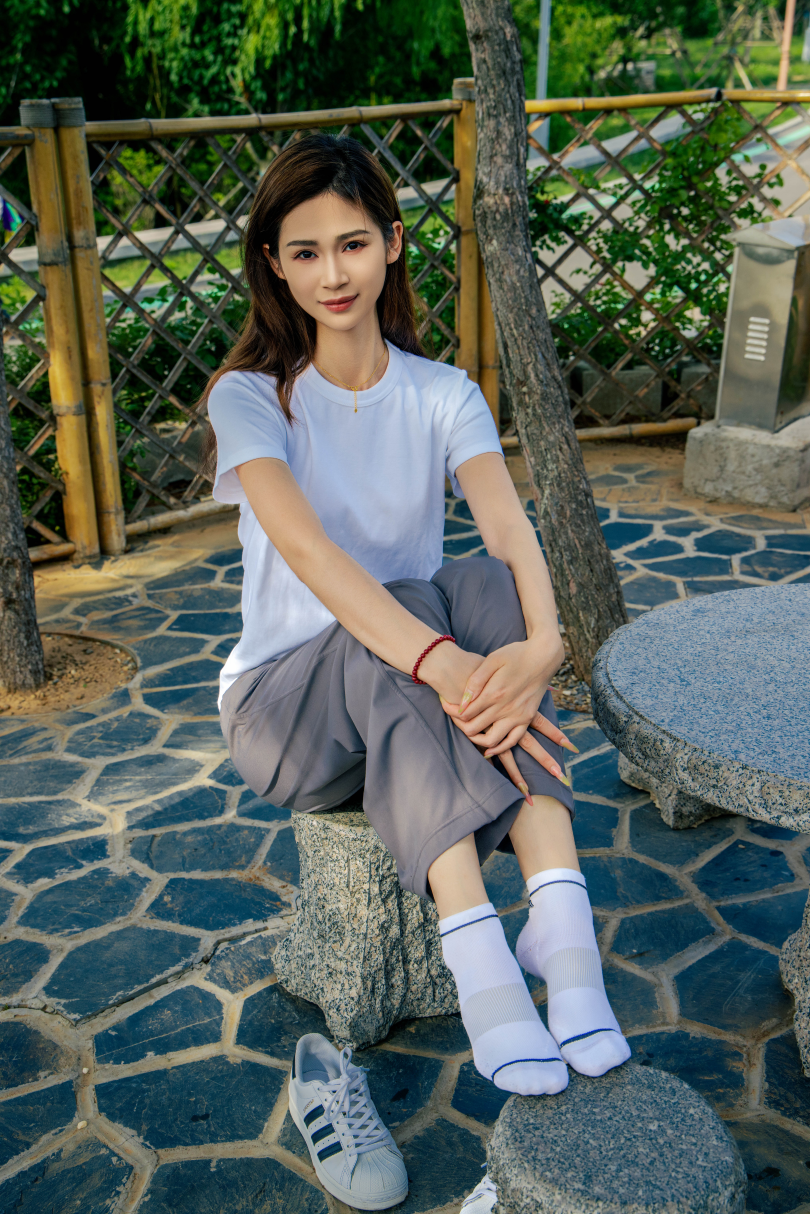足愉心摄影第46期:模特沐晴(搭配:白T恤、灰色长裤、白色棉袜、贝壳头鞋)