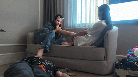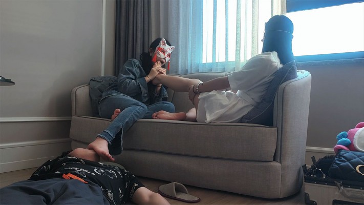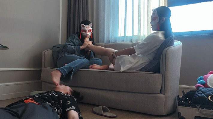 内容:女m战一柔舔女王的裸足,被脚深喉反复插嘴,之后女王教女m用同样的方式玩弄奴下奴,让奴下奴的舌头清理脚底。