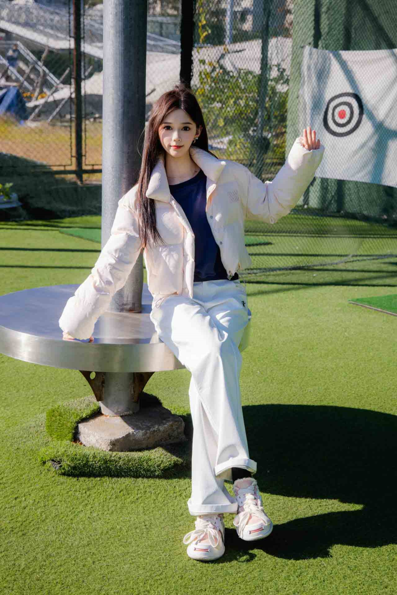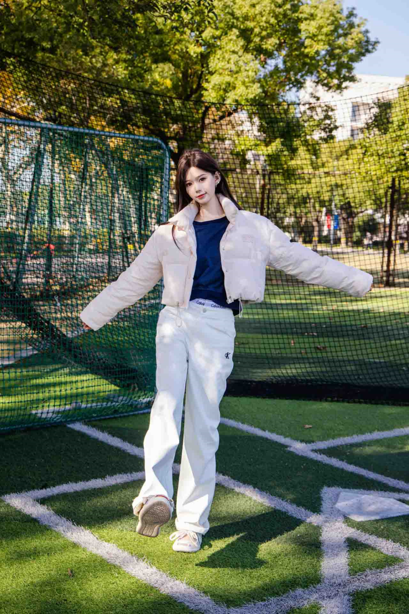 搭配内容:粉色羽绒服、白色长裤、黑色棉袜、运动鞋、裸足