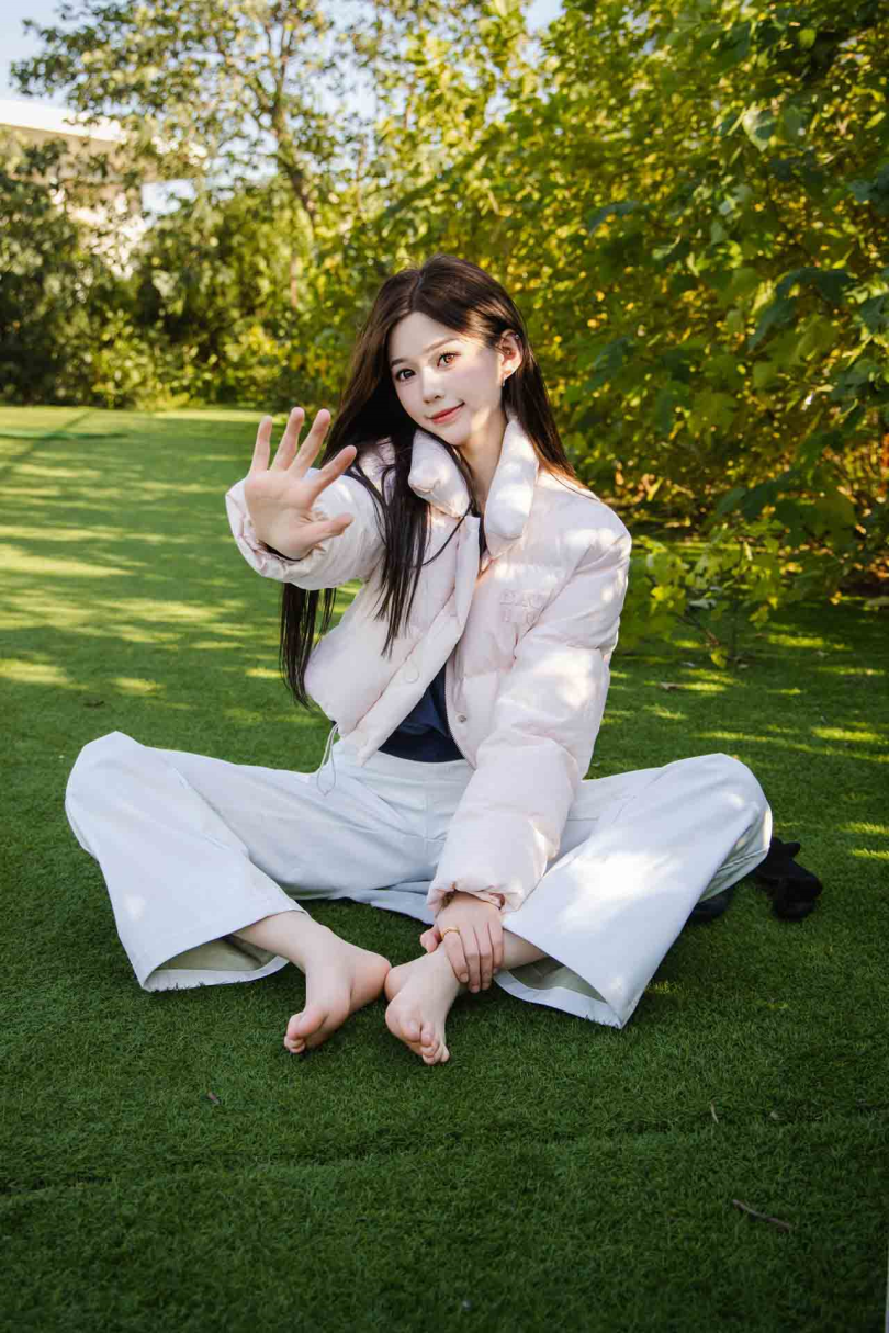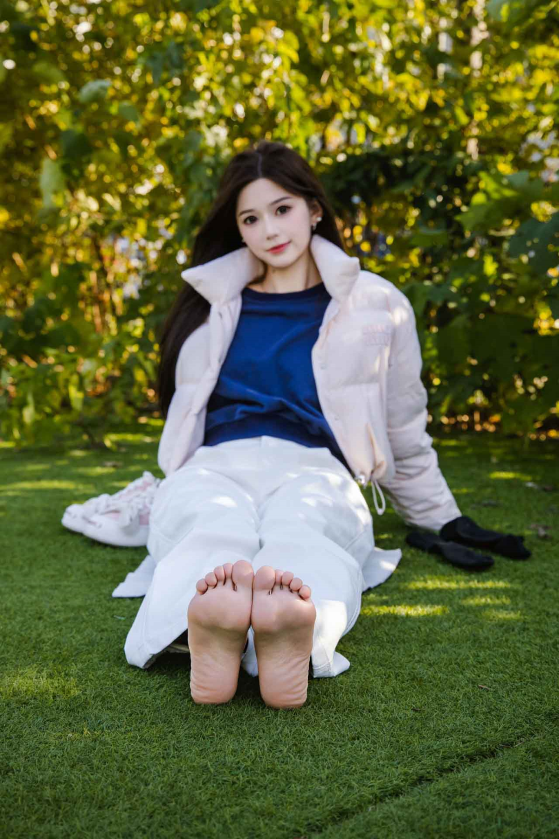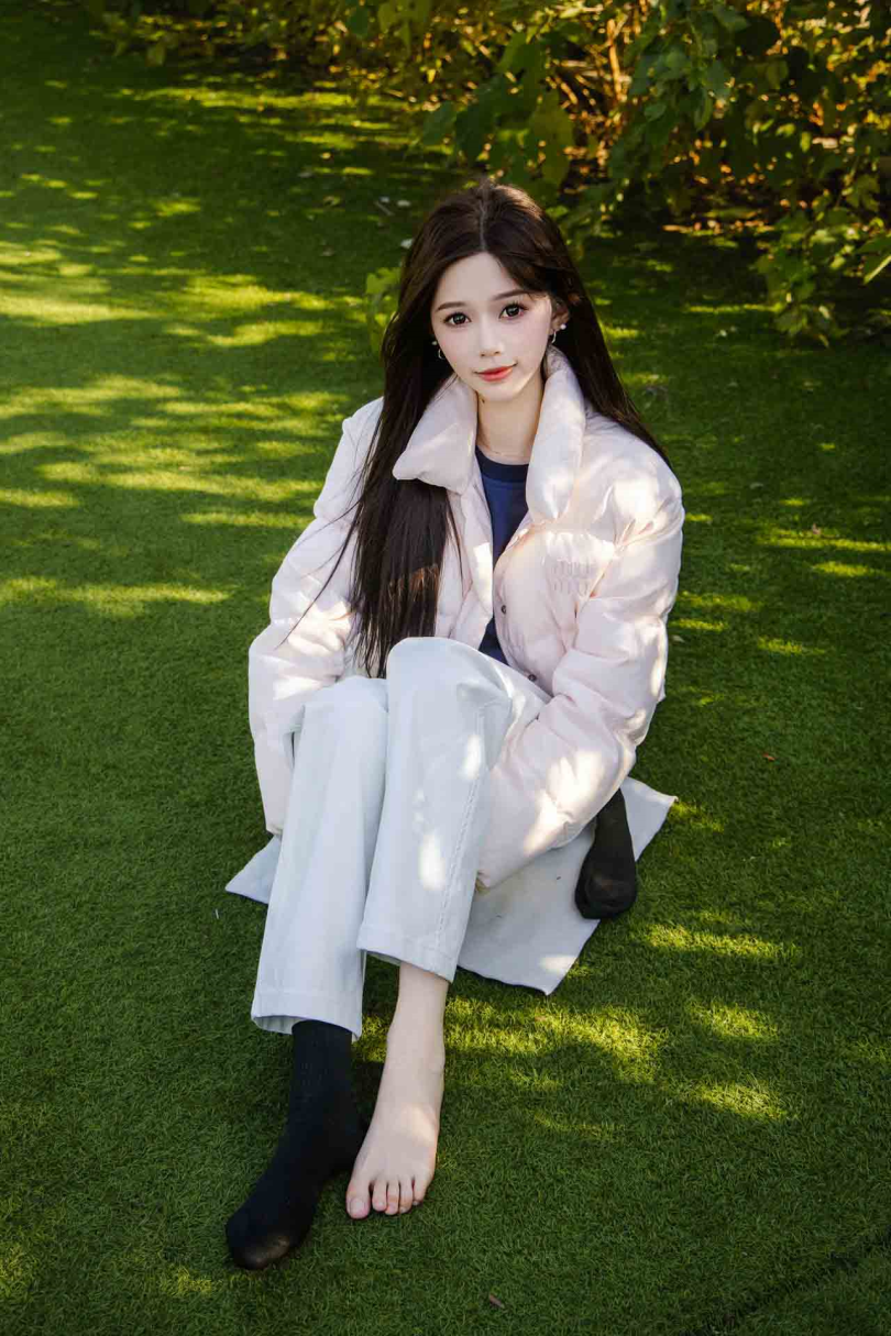 足愉心摄影第37期:模特心凌(搭配:粉色羽绒服、白色长裤、黑色棉袜、运动鞋、裸足)